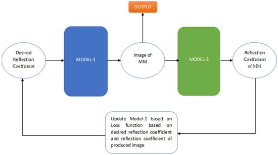 where Wt is new weights, Wt−1 is old weights, L is loss of the model, α is the learning rate. In nested-CNN, Model-2 that was used in Model-1’s loss function was trained first and used in the training process of Model-1. Loss value has been created by comparing the desired reflection coefficient, which was the input of Model-1 and the reflection coefficient, which was the output of Model-2. The schematic of the nested-CNN is shown in Figure 3. Model-1’s input and Model-2’s output were used in the MAE; the desired reflection coefficient and reflection coefficient of the produced image was compared and Model-1 was updated and improved using the defined loss method. S11D is the desired reflection coefficient, S11P is the generated image’s reflection coefficient, and MAE is calculated as given below: