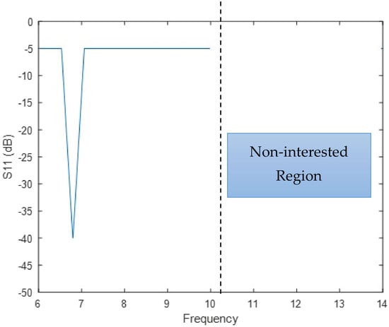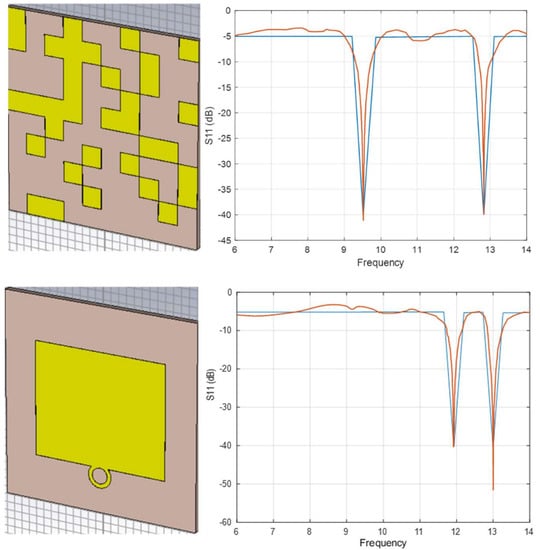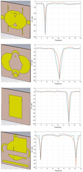 The nested-CNN’s performance was evaluated with six desired reflection coefficients. Desired reflection coefficient maximum value was chosen as −5 dB, the minimum value was chosen lower than −40 dB, the minimum bandwidth was chosen as 0.75 GHz. In Figure 8, the desired reflection coefficients, the image of MM—which is gradient-based generated by nested-CNN—and the simulation results of the image of MM are given.