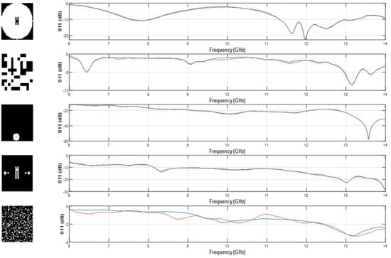 Five images of MM were used to compare Model-2’s result and the simulation’s result. These images have never been seen by Model-2 in the training process. In Figure 5, the first column corresponds to the randomly generated image of MM, the second column corresponds to the reflection coefficients of Model-2, and the reflection coefficient of simulation. The orange line represents Model-2’s result, and the blue line represents the simulation results.