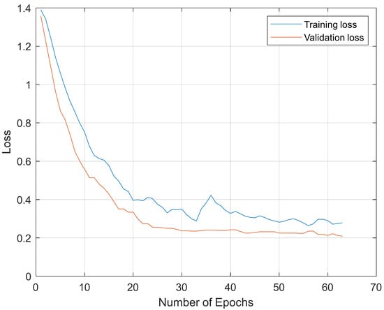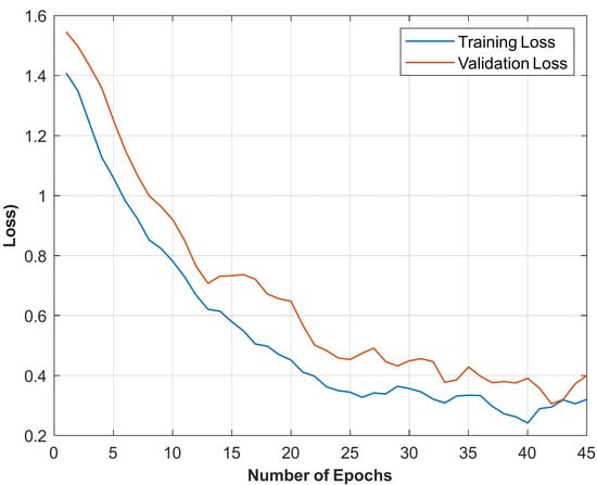 Early stopping was monitoring the MAE of desired reflection coefficient and the reflection coefficient of the produced image of MM. The nested-CNN was stopped at the 45th epoch to prevent overfitting by early stopping. Training loss and validation loss graphics are given in Figure 7.