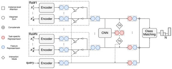 - Class Matching. Once the task-specific information is incorporated into the composed query representation and prototypes, these feature representations are then used as input and fed to a matching module to measure the relationship between query and class prototypes.