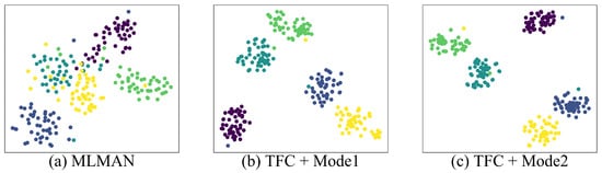 To explore in more depth what impact our model has on the features, we visualize the feature variations before and after employing the TFC module using t-SNE [36]. We find that our task-feature composition module not only works well in capturing task-specific information but also helps the encoders learn more discriminative sentence representations. Figure 3 shows the visualization results of query feature distribution. The features compute in a 5-way 1-shot setting. We randomly select 5 classes and 50 sentences for each class from the validation dataset. Figure 3a shows the MLMAN without using any task-specific information, while Figure 3b,c shows the visualization results for TFC + Mode1 and TFC + Mode2, respectively. It is clear that the our TFC models have more compact and separable clusters, indicating that features are more discriminative for the task.