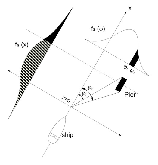Kunz [26] introduced another simplified mathematical model to calculate the probability of a collision event, based on the relative position between vessel and a bridge pier. The random variables are the course deviation with angle φ and the stopping distance, x (see Figure 1).