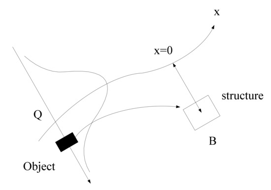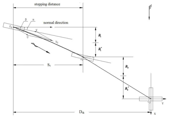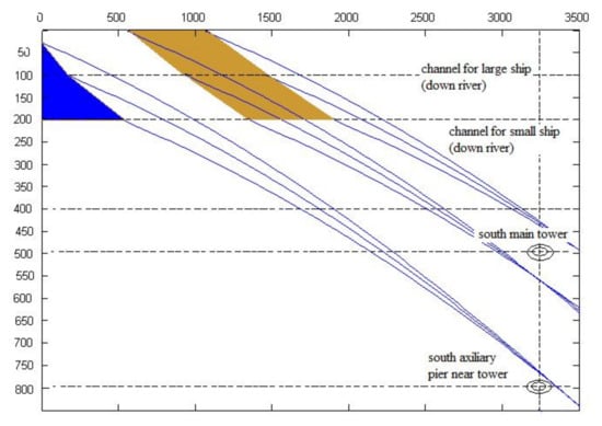 In the process of designing the Su-Tong Bridge in China, drift model was developed to calculate the probability of collisions between ships and the bridge pier [14]. The movement of an out-of-control ship is illustrated in Figure 4, where is ship instantaneous speed, is current speed, and is the ship speed over ground. When a ship is out of control, the ship’s motion can be divided into two steps. The first step is from Point (initial position when a ship is out of control) to , where the ship is moving with inertia under the forces from wind and currents. From Point to point (position of a bridge pier), only wind and currents are the major factors for the movements. Whether a collision happens or not depends on the fairway condition, currents, wind, and the positions of the piers, etc. There are formulas to calculate the lateral distances () in Figure 4, in which is the drift on axis x caused by the current within the stopping period, is the drift on axis x caused by wind within the stopping period, is the drift on axis x caused by the current without inertia, and is the drift on axis x caused by the wind without inertia. There are empirical formulas to calculate the lateral drifts. The stopping distance and stopping time are constant, and these can be found in the ship particulars. After numerous calculations of drift tracks from different ships with different initial speeds and positions in the waterway, the dangerous collision areas can be determined (shadowed areas in Figure 5).