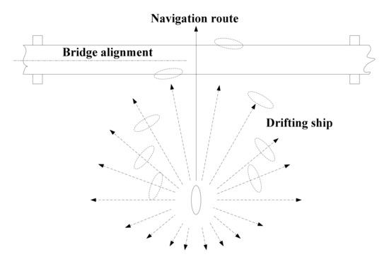 where = average speed of ship class, ; = maximum speed of ship class, ; and = causation factor, i.e., the probability of a collision if the ship is on a collision course [30]. The value = traffic density function of the ships given by the number of ships and the Gaussian distribution as described; the unit is the number of ships per unit area; and = distribution of speed of the ships. The value = simple geometrical collision indicator function, which is 1 when the ship strikes a pier or a girder and 0 when the ship either passes through the bridge line without collision or grounds before it reaches the bridge line, and = severity of the collision. This factor depends on the crushing force, i.e., type, ship size, ship velocity, the strength of the bridge structure, and several other parameters. = time and = axis along the bridge line. In Pedersen’s model, the collision frequencies are categorized and studied individually. Similar categories were also applied to the risk of collision with offshore wind farms [31]. The accident category 4 assumes that the ships drift uniformly over 360° around the bridge [28] (see Figure 3).