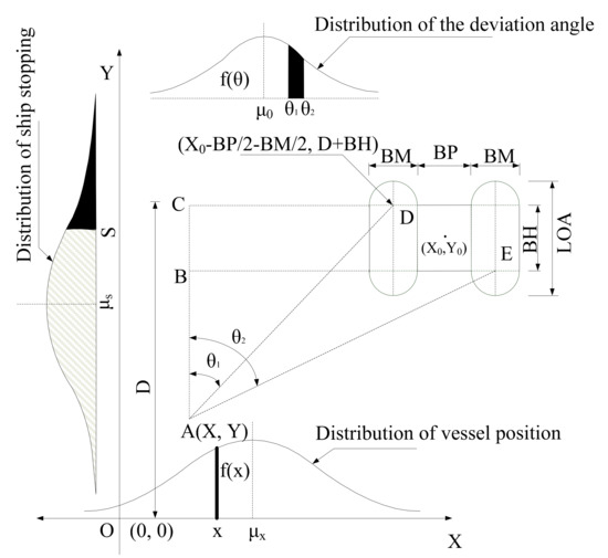 where = annual number of vessels in category j; = the distribution of vessel position in the x direction; = probability of aberrancy per unit travelling distance; = the probability of the ship stopping before the collision; and = the distribution of the deviation angle .