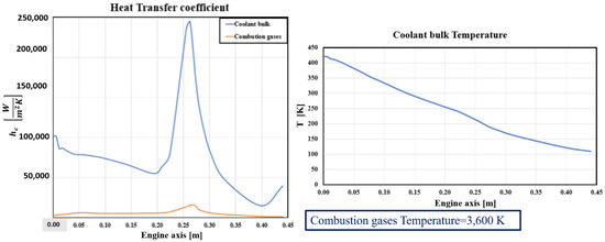 Pressures of the coolant and hot gases were considered as being uniform and equal to 12 and 5 MPa, respectively. A constraint in one node in the axial direction was applied to prevent rigid body motion. The thermal and structural boundary conditions are reported in Figure 7. Combustion gases, coolant bulk temperatures, and their respective heat transfer coefficients varied along the chamber axis, and their values were obtained by computational fluid dynamics (CFD) analyses [25]. In particular, as reported by Ricci et al. [29], two separate CFD simulations were conducted: