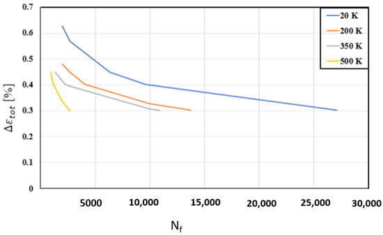 where γ m a x is the maximum shear strain amplitude on the critical plane, δ ε n is the normal strain excursion, and υ is the effective Poisson’s ratio. The experimental data regarding fatigue tests on CuCrZr coupons are reported in Figure 11 [16]. An analytical relationship between the equivalent strain amplitude and the number of cycles to failure was evaluated by adopting a multiple linear regression model to fit the CuCrZr experimental fatigue tests. Then, the equivalent strain amplitude ε a , e q , estimated according to the Wang-Brown method, was used to estimate the fatigue life according to the following relationship: