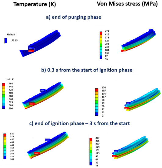 Figure 12. Temperature and von Mises stress contour plots: (a) end of purging phase, (b) 0.3 s from the start of the ignition phase, (c) end of the ignition phase.