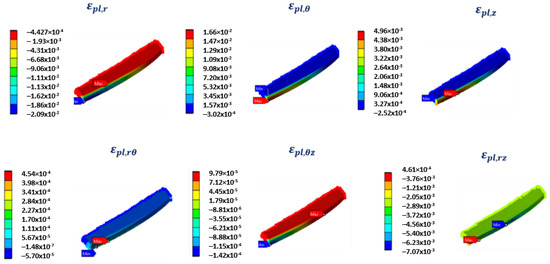 Plastic strains at the end of the ignition phase were reported in Figure 14. It was clear that the tangential strains were dominant with respect to other directions. However, the axial strains were non-negligible, since their maximum value was about one third of the maximum plastic strain in the tangential direction. This demonstrated the need to adopt a multiaxial fatigue criteria.