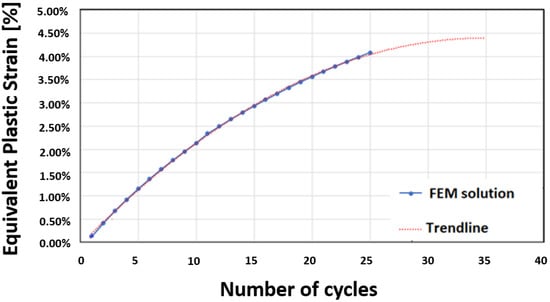 Figure 15. Equivalent plastic strain evolution with number of cycles.