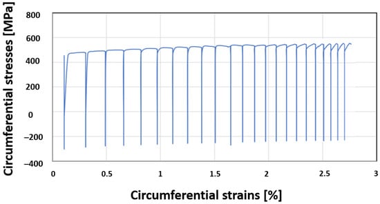 Figure 15 and Figure 16 show that the equivalent plastic strain increased cycle after cycle as a consequence of thermal ratcheting occurring in the ligament. The chosen kinematic hardening model with the three back stresses was capable of simulating ratcheting phenomena even after ten thermal–mechanical cycles. This result is in accordance with the results obtained in [3], showing that at least three Frederick–Armstrong kinematic hardening models should be considered when employing the Chaboche model, in order to properly allow for ratcheting. In fact, if just two hardening models were considered, the shakedown effect would anyway occur after very few cycles. A trendline was extrapolated from the FEM results and a stabilization of the equivalent plastic strains is expected to happen within 30–35 cycles, see Figure 16. As illustrated in Figure 15, Figure 16 and Figure 17, the increment of plastic strain decreased cycle after cycle. Therefore, it is very likely that a stabilization of the stress–strain curve could occur, even though there is no assurance that it will happen. In this case, LCF could then become the only type of possible failure for the cooling channel. Non-proportional loading effects should be considered; as a matter of fact, the plot of tangential stress vs. tangential strain for a node on the internal surface of the chamber does not depict a straight line passing through the origin of the axes, see Figure 18.