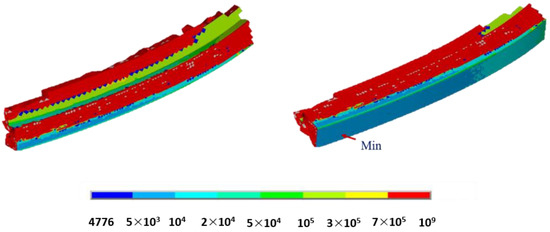 Finally, fatigue evaluations were carried out adopting the Wang-Brown criterion. Figure 19 shows the service life contour plot obtained employing the abovementioned criterion, highlighting the minimum value of 4776 cycles.