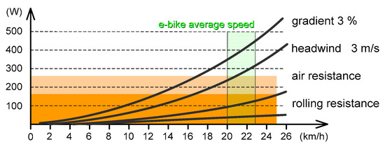 When riding, the biggest problems for the rider are hills and strong winds. The average rider develops 100 W recreationally and up to 200 W when in a good physical condition. A professional rider can normally produce 200 W to 300 W during a non-competitive session and in races of up to 400 W continuously over a distance of 14 km. The power requirements for riding are best described in Figure 1 [29]. The green interval indicates the average operational cycling speed that prevails during a cycling session, the orange-colored intervals present a maximum value of the power required, and a light-orange one is a power requirement in the event of the mean wind occurrence at the cycling site.