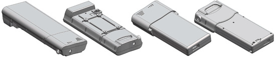 The bicycle battery, which is the subject of the further analysis, is shown in Figure 3, in the form of a CAD modeled object placed in its holder/carrier assembly. The reason for the CAD modeling of the Kalkhoff battery is closely related to the need for the further analysis involving the parameterization of the geometric variables of the circuit components (battery cells, enclosures, and BMS systems) and the application of the infrared thermography analysis. In Figure 3, the leftmost drawing shows a top view of the holder and the inserted battery, and the mid-left drawing shows a bottom view, while the mid-right and rightmost drawings show what the battery itself looks like when it is pulled out of the holder.