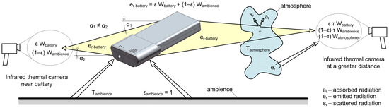 Given the distance, the atmosphere may have an effect on the registered radiation. The distance of the camera depends mainly on the optical angle of the camera lens. The closer the camera gets to the object to be analyzed, the weaker the influence of the atmosphere becomes, but the possibility of reflection of the operator’s radiation increases. In addition to the fact that the power dissipation inside the battery is higher, its radiation becomes dominant, and the influence of the ambient radiation on the overall balance becomes smaller. The smaller distance to the object has another effect—namely, the radiation captured at different angles relative to the normal on the surface. The acquisition angle is important because of the change in emissivity, which can be seen in detail in Figure 5. Emissivity is the most important parameter and can change depending on the viewing angle or different materials used. The emissivity also depends on the wavelength at which the object is observed [31]. The emissivity of the plastic, used for the housing, is 0.95. It is confirmed by sticking a strip of reference tape on the battery housing, which is not visible on any of the thermograms, thus confirming the choice of the correct emissivity. In Figure 5, in addition to the emission values at each angle shown with a red line, we see (in brown) the temperature value that the camera would associate with the same amount of radiation at different angles for the spot measurement from Figure 6a. A significant error in the choice of emissivity would result in the display of an incorrect temperature value, shown in blue in Figure 5.