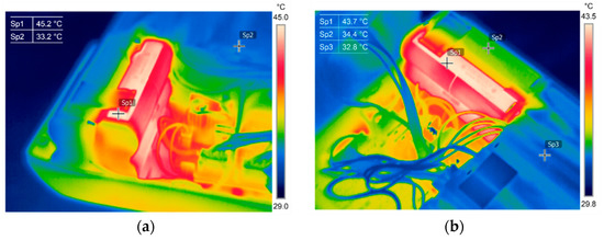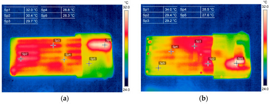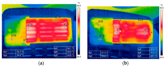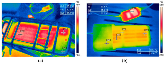 Further, in order to determine the condition of other cells in cellblocks, a different indirect thermal and electrical parameter observation method had to be used. For this purpose, a balancing resistor thermal throttling observation combined with the thermal imaging analysis was applied. The thermogram shown in Figure 12a illustrates that there is no dissipation on the two resistors, which means that only two parallel connections are still in the charging process and that most of the parallel connections are in a similar state. Additionally, that points to the fact that the battery blocks are not homogeneous in their electrical (resistive/ohmic) properties. Figure 12 visually describes the dynamics of BMS operation as well as dissipation, which leads to an increase in the pack ambient temperature of 6 °C, while the maximum temperature of the active resistor at the time of recording increases by 19.6 °C.