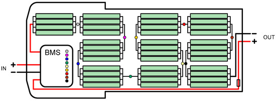 The battery pack structural analysis resulted in a circuit principal diagram, shown in Figure 10. The results can be summed up as follows: the battery pack consists of 40 cells Panasonic CGR18650CG type, cells nominal voltage is 3.6 V and nominal charge capacity of 2250 mAh, individual cell weight is 45 g [33]. The electrical connections arrangement was made in the form of ten cell blocks connected in series (10s), and each cell block consists of four parallel connected cells (4p)—a so-called the 4p10s battery cluster. The way cells are joined together is crucial for packet behavior [34,35]. The balancing leads connection points, for the sake of clarity, are marked with colored circles at the BMS and in between cellblocks. Each balancing line has temporally thermal overcurrent protection accomplished by Polymer PTC Resettable Fuse of JK-D Series; furthermore, the BMS has two additional thermal monitoring and protection probes.