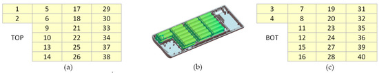 Labels of individual cells in the pack arrangement, an assembly (b); a top cell layer TOP (a); a bottom cell layer BOT (c).
