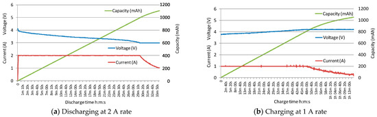 In order to confirm cells’ capacities determined with the discharging method, a second approach was employed to validate the results. That approach relied on and utilized the charge counting method while the cell was charged up to its maximum voltage but with current that was lower in relation to the nominal discharge current of 2 A—i.e., charge current of 1 A was used. The results of the capacities determined in this way are shown in Table 3.