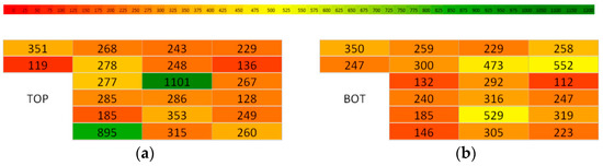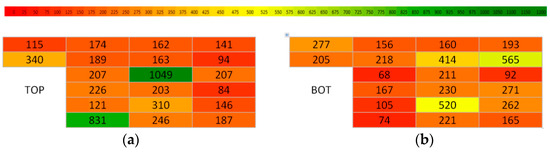 Spatial distribution of TOP/upper- (a) and BOT/lower-layer (b) pack cells capacities.