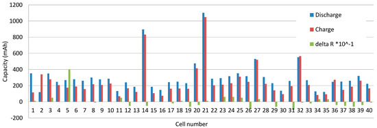 The results support the confirmation of the poor pack assembly state and cells degradation determined by the discharging method. The comparison of cells capacities, determined with the charging and discharging method, shows a capacity deviation in accordance with the expectation [41,44], as presented in Figure 20. A cell parameters degradation was expected [45,46], but in the case of the analyzed battery pack, it occurred rather quickly.