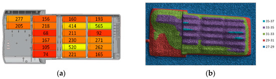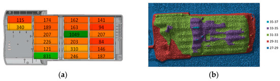 The visualization of the spatial capacity distribution within the battery pack as well as the corresponding temperature distribution are shown in Figure 21 and Figure 22. Unlike the previously presented thermograms, we decided to export the radiometric data to a more readable and convenient form for a further analysis—a CSV file—and to display it in a different form by processing in a basic spreadsheet tool.