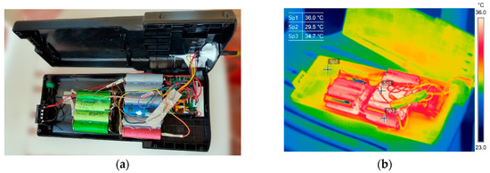 Thermography easily finds its application in the battery analysis [32]. Unfortunately, the thermographic analysis is challenging in our case due to the closed system, mainly because the measurement of electrical parameters is not possible. The consideration of using the thermographic analysis as a method for evaluating the condition of the battery and diagnosing faults arose from the fact that the available range is constantly decreasing after each full charge cycle. Thus, there was a need for a non-invasive analysis method that would not interfere with the functionality of the battery under operating conditions. Figure 6 shows a thermographic recording of the battery pack during charging, near the end of its life. The image was taken when the range of the bike was significantly decreasing. Figure 7 shows the same battery and its thermographic pattern during charging, taken when the battery was at the beginning of its life, long before the images in Figure 6 were taken. The battery in Figure 7 shows a nearly uniform thermal pattern of a fully functional battery that is in excellent condition. However, this uniform thermal pattern has a slight disturbance in the heat distribution pattern caused by the spatial distribution of heat sources in the battery pack or cells.