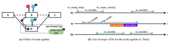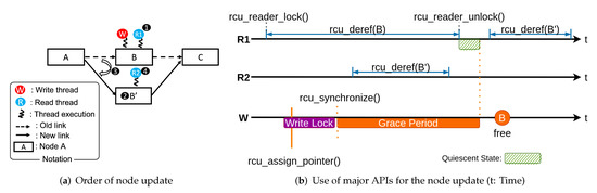 Through Figure 1b, we explain a relationship between the threads and API usage required in the process of Figure 1a. Thread R1 enters the critical section through rcu_read_lock(). Thread R1 reads node B using rcu_deref() in critical section (❶). Thread W acquires the mutual exclusive lock for write operations, creates B’, which is a copy of node B (❷), and performs an update through pointer assignment operation using rcu_assign_pointer() (❸). Then, thread W releases the lock (at the end of the Write Lock region in Figure 1b). While thread W updates node B, R1 still reads node B without interruption. R1 reads node B (denoted as rcu_deref(B) in the figure) because it reads the A’s next node through rcu_deref() before the rcu_assign_ptr() of thread W ❸. R2 reads node B’ (denoted as rcu_deref(B’) in the figure), because it reads the A’s next node through rcu_deref() after the rcu_assign_ptr() of thread W ❸. The rcu_assign_pointer() and rcu_deref() prevent instruction reordering through memory barriers, compiler directives, etc., so that appropriate nodes can be read before or after the change of the nodes. Thread W calls rcu_synchronize() to wait until R1 finishes reading to node B, and then, it releases the original node (denoted as free in Figure 1b). The waiting period is referred to as the Grace Period of thread W in Figure 1b. The quiescent state means a state in which threads are not accessing shared data. The area on thread R1’s timeline in Figure 1b represents the period following R1’s completion of reading node B. The Grace Period ends when all read threads have passed the Quiescent State [37,55]. To summarize RCU, read threads access nodes without any lock, and a write thread releases a node when all the readers in the critical section pass the Quiescent State after the node is modified.