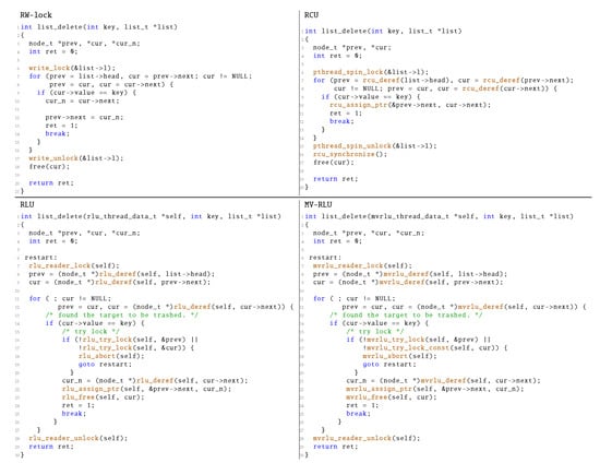 Figure 4 demonstrates API examples of RW-lock and RCU-style synchronizations applied to a singly linked list node deletion. RW-lock and RCU update employ the coarse-grained locking approach, while RLU and MV-RLU use hand-over-hand locking, one of the fine-grained locking policies, according to the synchronization method’s design approach [9]. Hand-over-hand locking is a mechanism that allows several threads to access data structures in a secure manner [9]. It is a procedure for acquiring locks on a target node and the prior node together, conducting operations, and then releasing the locks.