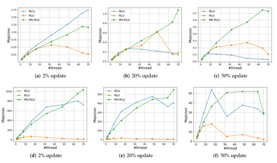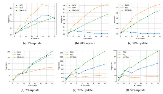 Hash table: The performance result of the chained hash table is quite different from that of the linked list. RCU shows a performance increase in proportion to the number of threads in all update ratios, but a certain number of threads experience a performance drop or saturation. These phenomena are clearly observed in the execution of 18 and 24 threads that exceed the NUMA node boundary in all update cases. Please note that the main thread of the benchmark is pinned to the core 0 of CPU 0, and the threads that perform benchmark operations are sequentially allocated to the core 1 to 17 of CPU 0, so the 18th thread is assigned to CPU 1. RLU shows the best performance in the linked list evaluation but the lowest in the chained hash tables. At the 2% update ratio, performance tends to increase relatively linearly, but at the 20% or 50% update ratio, the performance decreases or gets saturated after running 18 threads. MV-RLU shows the best performance among the synchronization schemes. Although the performance of MV-RLU is almost in par with RCU on the 2% update ratio, MV-RLU shows the best performance in almost all cases. Although the performance impact varies depending on the synchronization mechanism, all schemes show the NUMA boundary effect. As shown in Figure 5d–f, when threads are allocated across NUMA nodes 0 and 1, the performance degrades or is saturated. When execution threads are spread across multiple NUMA nodes, the cost of accessing data structures and synchronizing caches increases.
