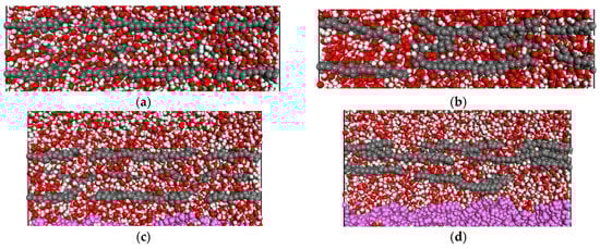 In the case of the supported systems the inner layers were more anchored to the polymeric films. Several water molecules were encountered between the polymer and the nanosheets of the first layer. The immobilization of the nanosheets should be attributed to non-covalent bonds of the water molecules that bridge the polymeric surface and the GO. It has been observed in the literature that these interactions are associated with strong hydrogen bonds formed between the water hydrogens and the oxygens of the functional groups of the nanosheets [49,50]. Representative hydrogen bonds of water molecules bridging the polymer and the first GO layer are shown in Figure 4, as snapshots corresponding to the initial and final configurations of the NPT equilibrations.