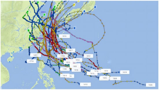 - Ying, M.; Zhang, W.; Yu, H.; Lu, X.; Feng, J.; Fan, Y.; Zhu, Y.; Chen, D. An Overview of the China Meteorological Administration Tropical Cyclone Database. J. Atmos. Ocean. Technol. 2014, 31, 287–301. [Google Scholar] [CrossRef] [Green Version]