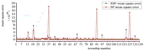 | Township Number | Township Name | Actual Value (×10−2) | RBF Predicted Value (×10−2) | RBF Error Value (×10−2) | BP Predicted Value (×10−2) | BP Error Value (×10−2) |