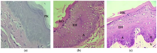 Epithelial hyperplasia is observed from the basal strata and toward the superior strata, and it is also manifested in the presence of acanthosis (Figure 1b,c,e,f). The inflammatory infiltrate is minimal (Figure 1c) and null in the male 5% group (Figure 1f).