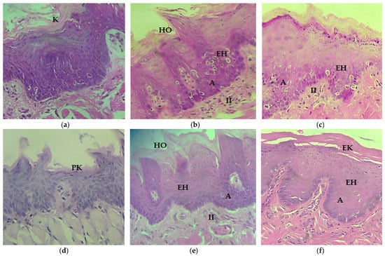 Histological modifications of the cheek mucosa tissue with hematoxylin–eosin (H&E) staining (40×). (a) Female control group, (b) female group 40% alcohol consumption, (c) female group 5% alcohol consumption, (d) male control group, (e) male group 40% alcohol consumption, and (f) group of males consuming 5% alcohol. PK, parakeratinized; K, keratinized; HO, hyperorthokeratinized; HK, hyperkeratinized; EH, epithelial hyperplasia; A, acanthosis; II, inflammatory infiltrate; V, blood vessels.