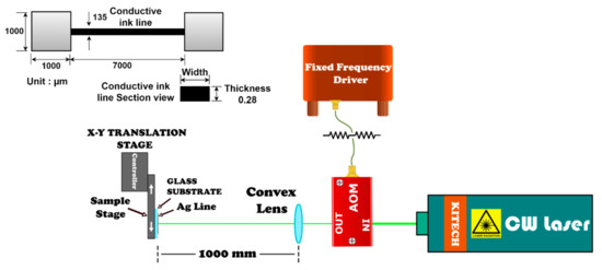The prepared sample was mounted on an X-Y translational stage (SGSP20-35, Sigma Koki Co. Ltd., Sumida-ku, Tokyo, Japan). The translational stage could operate up to a maximum scanning speed of 4000 μm/s. An acousto-optic modulator (AOM) connected to a fixed frequency driver (AA Optoelectronics Laboratory version, Nicolas Appert, Orsay, France) was used to modulate an Nd: YAG continuous wave laser beam (Coherent Verdi V5, 532 nm, Coherent Inc., Santa Clara, CA, USA) into the desired pulsed laser operation. Scanning speeds of the modulated laser were varied at 14, 27, 81, 135, and 189 μm/s. During laser scanning the beams overlapped at 95%, 90%, 70%, 50%, and 30%, with above mentioned scanning speeds of 14, 27, 81, 135, and 189 μm/s, respectively. The Bragg angle of the AOM was adjusted at 3° for maximized laser power. The laser power was maintained at 276 mW from the AOM outlet. The repetition rate and the pulse duration were controlled via an arbitrary waveform generator (Agilent 33250A, Agilent Technologies, Santa Clara, CA, USA). Among various parameters, 100 ms pulse duration and 1 Hz repetition rate were especially adopted for the numerical calculations. The schematic of the experimental setup along with the printed ink line is shown in Figure 1. A convex lens was positioned in front of the AOM at a focal length of 1000 mm from the sample. The beam diameter at 1000 mm focal length was approximately 270.9 μm (at 1/e2 of Gaussian distribution), which was designed to cover the total width of the printed Ag NPs line (135 μm). Approximately 50% of the Gaussian beam profile covered the entire width of the printed line as illustrated in Figure S1 (Supplementary Materials). This value was equal to the full width at half maximum (50%) of the Gaussian beam profile allowing the intense portion of the Gaussian beam to irradiate on the surface of the Ag NPs line. Finally, the power of the pulsating beam was measured with a laser power meter (FieldMax11-TO, Coherent Inc., Santa Clara, CA, USA).