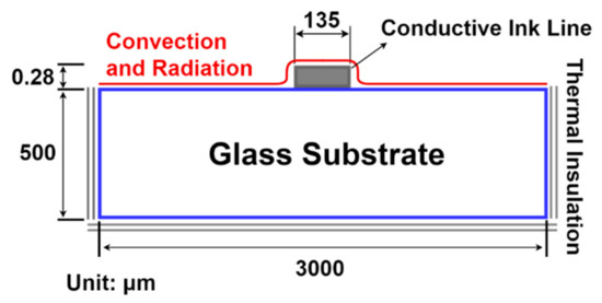 A three-dimensional numerical calculation was carried out in COMSOL Multiphysics for thermal analysis of the pulsed laser sintering process of inkjet-printed Ag NPs lines on glass substrates. The two-dimensional cross-sectional schematic of the three-dimensional calculation model is presented in Figure 2. The three-dimensional model is depicted in Figure S2 (Supplementary Materials). The following assumptions were adopted for the calculation model. The absorbed laser energy was completely converted into heat and no phase change was considered for the Ag NPs because of the high melting temperatures of Ag NPs. Constant specific heat and density were adopted for Ag NPs. The initial condition was set at 20 °C. The convection and radiation boundary conditions were applied on the surface of the printed conductive ink line and the glass substrate in the form of external natural convection. The natural convection coefficient is expressed in Equation (S1) (Supplementary Materials).