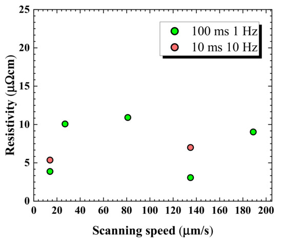 The obtained minimum resistivity is an improved result compared with those from previous laser sintering studies [35] and conventional oven sintering at much higher temperatures and longer processing times [36,37]. Using similar Ag NPs ink composition, Moon et al. [38] were able to produce 5.8 μΩ·cm via furnace sintering at 250 °C for 30 min. Moreover, the obtained minimum resistivity of approximately 3 μΩ·cm with 100 ms, and laser parameters of 1 Hz, 276 mW, and 135 μm/s is lower than the reported values from several other sintering methods [18,39]. The discrepancies among the resistivity values in Figure 3 have been found to be caused by several parameters such as surface morphology [40], laser wavelength effect [35,40], properties of the organic additives used in the NPs ink [16,41], the size of NPs [36,42], laser power, and scanning speed [14,35,43].