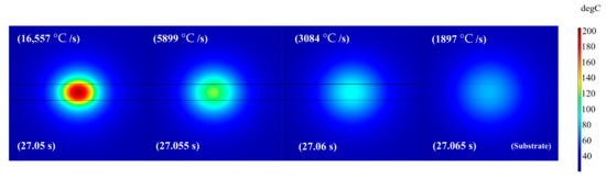 Typically, the heat relaxation time depends upon thermal diffusivity caused from the increase in thermal conductivity and the decrease in heat capacitance. The abrupt cooling rate within the initial time step after the peak temperature and the relatively moderate cooling rates afterward, can be elaborated by the 2D surface plots as shown in Figure 5. The time steps and the cooling rates for Figure 5 are extracted from Figure 4. The reason for an abrupt cooling rate is due to the relatively small heat capacitance of silver nanoparticles (bulk Ag, cp = 245 J/kg·K [34]) adopted in this study and high thermal conductivity induced after the laser shot. The thermal conductivity of the glass substrate was known to be very low at 1.05 W/m·K, which could not effectively act as a heat sink to help a faster heat relaxation in the Ag NPs layer [46,47]. Therefore, the cooling via radiative and convective cooling might be responsible for this fast cooling rate.