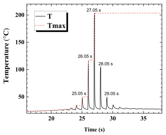 The periodic temperature fluctuations caused by the pulse interaction and relaxation periods are depicted in Figure 4. The position where the maximum temperature appears coincides with the center of the irradiated laser beam at the specified moment. The 7000 μm-long Ag NPs line is completely covered in approximately 52 s with a scanning speed of 135 μm/s. The maximum recorded temperature was around 204.4 °C. As mentioned before, 5.8 μΩ·cm were obtained via furnace sintering at 250 °C for 30 min. However, the lower resistivity of 3 μΩ·cm was produced at 204.4 °C in scanning pulsed laser sintering. The drop in the temperature profile after attaining the maximum local temperature at the end of each pulse is due to the pulse relaxation (0.9 s pulse relaxation period). During the laser interaction period of 0.1 s, the energy is absorbed by the NPs and subsequently conducted to the surrounding NPs. The laser energy absorption and the subsequent heat loss from the NPs to their surroundings occur in less than 1 ns [44,45]. Therefore, the 0.1 s laser beam interaction period with the Ag NPs is long enough to cause a continuous rise in the process temperature. The rise and fall of the temperature in the plot depict the corresponding laser excitation and relaxation periods. During the simulation, the starting position of the laser scan was at the boundary of the Ag NPs pad and Ag NPs line such that half of the laser beam irradiated on the pad and half on the Ag NPs line. From the plot we notice that the temperature rise is instantaneous as the pulse interacts with the NPs without any time delay. However, the maximum temperature is attained after the laser irradiation of 0.1 s. As soon as the pulse is relaxed (no heat source) the underlying NPs start to cool, and it takes 0.905 s (0.9 s of no heat source and 5 ms of step time delay) to reach to near room temperature until the next pulse hits. For the first laser pulse in Figure 4, the temperature in the underlying Ag NPs layer increases and the Ag NPs layer is thermally sintered, subsequently, increasing the corresponding thermal conductivity of the Ag NPs. In the following pulse relaxation period, the process temperature drops, and the thermal conductivity of the heated zone is initialized with the value of the corresponding maximum temperature induced in the previous laser shot. The plot shows that a peak temperature of about 204 °C is obtained at around 52 s. The peak temperature of around 207 °C produced by the first pulse is slightly higher than the following peak temperature of about 201 °C. The slightly lower following peak temperature of 201 °C is due to the absorption into 50 % of the already irradiated area. As a result, half of the laser irradiation is absorbed by the area with high thermal conductivity. This resulted from the high thermal diffusivity which was caused by a slightly higher temperature from the previous laser pulse.