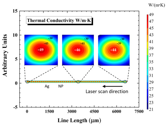In Figure 7, the spatial distributions of thermal conductivity are presented at three points located in the start, middle, and the end of the printed line. Due to the nature of the Gaussian beam, a decrease in the temperature was witnessed away from the center of the beam [48]. At the start of the silver line, maximum value of about 44 W/(m·K) is recorded against the maximum temperature of 201 °C. Furthermore, as we progress, the conductivity of 46 W/(m·K) value is recorded against 203 °C at the middle of the line, and, finally, the conductivity of 49 W/(m·K) value against 204.4 °C.