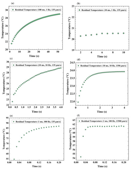 Furthermore, Equation (3) tells us that a longer pulse duration will cause a wider thermal diffusion length. The reason is that a longer pulse duration supplies prolonged thermal energy to the underlying NPs providing enough time for the wider propagation of heat as reported in a previous study [26]. The vertically deeper heat diffusion length is known to cause complete sintering which tends to increase the possibility of the adhesion strength between the NPs layer and the underlying substrate [26,40,49]. Figure 9 presents the residual temperature plots under the varied experimental parameters. The corresponding maximum temperature plots are presented in Figure S4 (Supplementary Materials). The laser power for each case was adjusted such that each case produced almost similar temperatures at the start of the laser scan. The cases shown in Figure 9a–c,e have the same scanning speed, while the scanning speed of the cases shown in Figure 9a,d,f were chosen so that the cases have the same pulse overlap. For the thermal diffusion lengths of 100, 10, and 1 ms through the glass substrate are calculated to be 438.5 μm, 138.6 μm, and 43.8 μm, respectively. These values suggest that longer pulse durations affect the substrate to a comparatively higher degree.