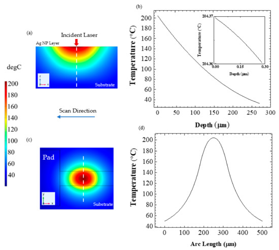 Figure 10a,c show the temperature distribution of heat-affected zones in the vertical direction and on the surface of the glass substrate at 51.05 s. The temperature distributions are recorded at the end point of the Ag NPs line where the peak temperature of approximately 204 °C occurred at the center of the irradiated beam profile. Figure 10b depicts the temperature curve along the broken line into the glass substrate as shown in Figure 10a. In Figure 10d the profiles of the temperature distribution along the broken line in Figure 10c resemble a Gaussian profile of a laser beam. The thin solid lines in Figure 10c are the printed Ag NPs line and the pad. The temperature at the edge of the Ag NPs line is around 162 °C and is further reduced as the distance is increased away from the beam center. These estimated temperatures are allowable for the flexible polyimide (PI) substrates which have a glass transition temperature of around 385 °C during thermal sintering [18,42].