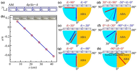 Figure 2c–h show the theoretical propagation paths of reflected waves through the AM with different incident angles. Here, based on Equation (2), we can theoretically calculate the reflected angles θr = 0°, −30° and −90° for the incident angles θi = 90°, 30° and 0°, which are shown in Figure 2c,e,g, respectively. Beyond that, when the incident angle decreases from 90° to 30° (Figure 2d) and from 30° to 0° (Figure 2f), the corresponding reflected angles change from 0° to −30° and from −30° to −90°, respectively. Here, note that the incident waves with the angle 0° ≤ θi ≤ 90° cannot reach the right side of the AM (yellow region), which is defined as an acoustic blind area (ABA). As shown in Figure 2h, when the incident angle is inside the ABA (−90° ≤ θi < 0°), we obtain based on Equation (2); therefore, the incident sound energy cannot be reflected by the AM but is transformed as the form of surface evanescent wave [44].