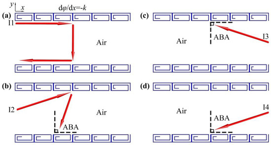 To provide insight into the mechanisms of low-frequency BSI, we present the schematic diagrams of propagation paths in the tunnel for the left and right incidences of sound based on wave modulations of both AMs. As shown in Figure 4a, for the incident wave I1 from the left side with the angle θi = 90°, the sound energy was reflected by the upper AM with θr = 0° and then was reflected back by the bottom AM with θr = −90°. Beyond that, for the other incident waves with the arbitrary angle in the range 0° < θi < 90° (I2 in Figure 4b), the incident wave was reflected by the upper AM with the angle θr < 0°, and therefore, the sound energy was reflected to the bottom AM, which was transformed into the surface evanescent wave owing to the ABA. Figure 4c,d show the propagation paths of the incident waves I3 and I4, respectively, from the right side with the arbitrary angle in the range −90° ≤ θi < 0°. We can see that I3 and I4 could be directly transformed into the surface evanescent wave by the AMs on both sides of the tunnels, owing to the ABA. Therefore, based on the sound reflections and the ABA created by the gradient phase of the AMs, the incident sound energy on both sides could not transmit through the tunnel.