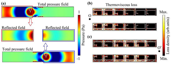 (a) We simulated total pressure distributions and corresponding reflected pressure distributions through the low-frequency BSI tunnel by separately placing a cylindrical sound source at O and O′ at 343 Hz. We also simulated thermoviscous loss density distributions in the unit cells by separately placing a cylindrical sound source at the points (b) O and (c) O′ at 343 Hz.