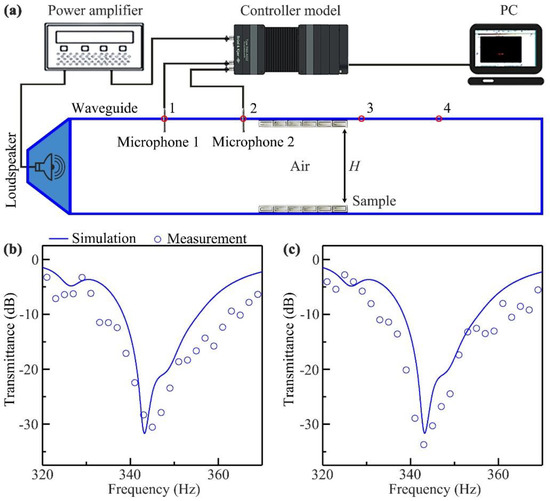 To experimentally demonstrate the performance of the designed tunnel, we experimentally measured the transmittance spectra through the sample for the left and right incidences in a straight waveguide with the size of 2 × 0.4 × 0.06 m3. The experimental set-up is shown in Figure 6a. The sample, made of epoxy resin by 3D printing technology, was placed in the middle region of the waveguide, which was constructed from acrylic plates to satisfy the sound-hard boundary condition. The parameters of the sample were the same as those in Figure 3a. A loudspeaker, driven by a power amplifier, was placed at the left entrance to generate incident sound signals, and two 0.25 inch microphones marked as Microphones 1 and 2 were separately placed into the waveguide at Holes 1 and 2 and the Holes 3 and 4 to detect sound signals. The measured data was recorded by the controller module, and was analyzed by the software PULSE Labshop. The types of instruments used in the experimental measurement are listed in Table 3.