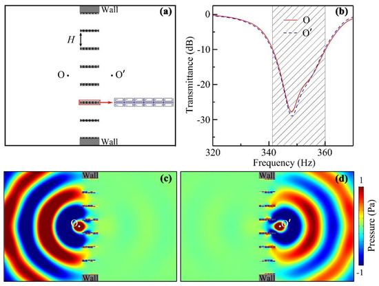 Next, we designed a low-frequency low-reflection BSI tunnel, which consisted of a pair of ultrathin AMs attached symmetrically on both sides. The schematic diagram of the proposed tunnel is shown in Figure 3a, in which a cylindrical sound source was separately placed at the point O or O′ in the following studies. The corresponding settings of the numerical models are shown in Table 1. Figure 3b,c show the simulated transmittance and reflectance spectra through the tunnel, respectively. We can see that the transmittance spectra were almost the same for both cases, and the transmittances were below −10 dB in the range 337–356 Hz (black shaded region), with a minimum value of −27 dB at 343 Hz, showing a typical characteristic of low-frequency BSI. Beyond that, the thickness h of the AM was 28.5 mm, which is equal to λ/35 at the valley of spectra, exhibiting an ultrathin characteristic of the AM. However, it is worth noting that the incident sound energy was not reflected totally for both cases (shown in Figure 3c), and the reflectance spectra were different in the working band, in which the reflectances excited by the cylindrical sound source at O′ were obviously lower than those at O, a result that may have arisen from different mechanisms of sound modulations on both sides.