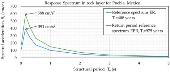 The spectral accelerations in the rock layer at the site of interest can be obtained using the PRODISIS program, developed by the Comision Federal de Electricidad, where the probabilistic seismic hazard map of Mexico is shown [4]. The software contains the mapped seismic spectral acceleration in the rock layer, requiring the location of the structure as input, and the program will show the acceleration graph and named reference spectrum ER with an optimal return period, . In addition, the software allows us to modify the return period using a specific value, where the spectral acceleration values will be adjusted, showing a graph called return period reference spectrum, or in Spanish, Espectro de Referencia a un Periodo de Retorno (EPR).